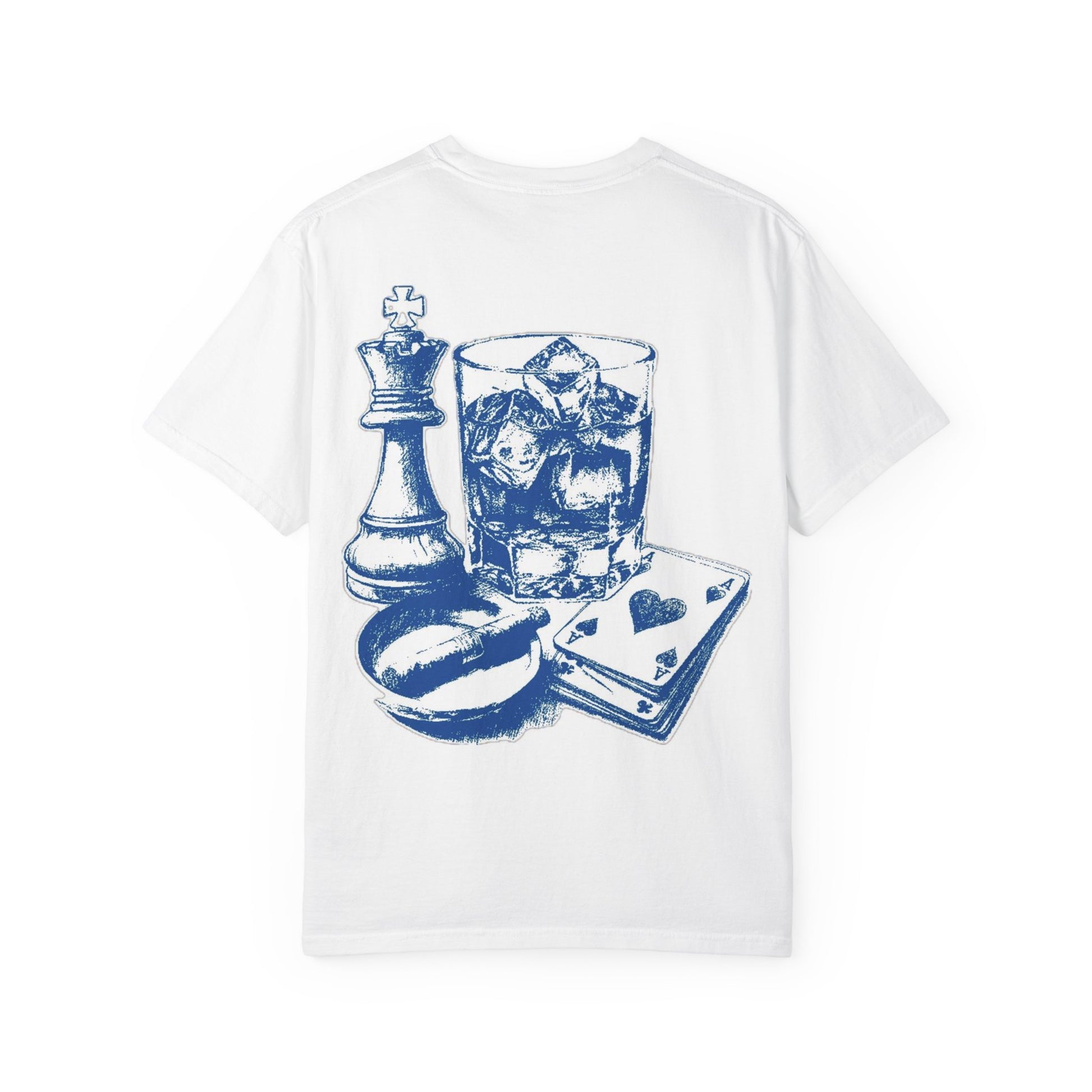 Minimalist in color but bold in message, the "All I Need" oversized tee features a striking blue graphic on the back that blends classic vices and symbols of power. The artwork includes a king chess piece, a glass of whiskey on the rocks, a pair of aces, and a smoking cigar in an ashtray — a visual narrative of strategy, indulgence, and chance.
